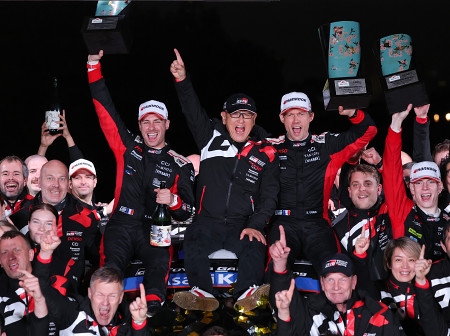 自動車の世界ラリー選手権(WRC)第13戦、ラリー・ジャパン最終日。優勝し、喜ぶセバスチャン・オジェ(中央右、フランス)らトヨタチーム。中央はトヨタ自動車の豊田章男会長=9日、愛知県豊田市 【時事通信社】