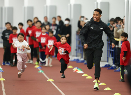 日本陸上競技連盟創立100周年を記念するイベントが東京・国立競技場で開催された。小・中学生対象の教室では、東京世界陸上代表のサニブラウン・ハキーム選手がゲストで登場し、子どもたちと一緒に走った=29日 【時事通信社】